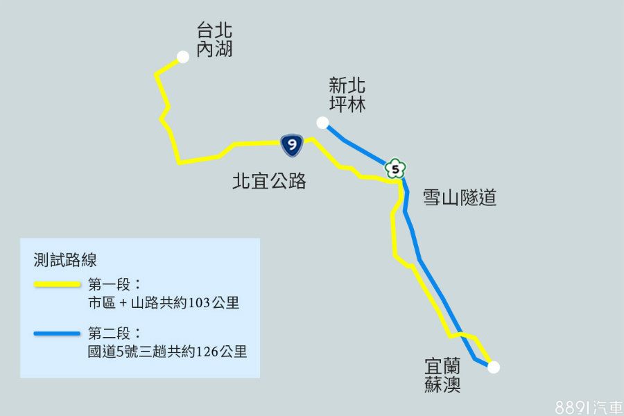 200km路線 含括市區、山區與高速測試路線比照導購頻道路線,市區+山區路段以台北內湖加油站為起點,行經台北市區、新店,穿過北宜公路抵達宜蘭,再走宜蘭市區抵達蘇澳加油站為終點,不走高速與快速道路,以Google地圖計算約103km;高速路段以蘇澳加油站為起點,行經國五繞行折返點坪林交流道3趟,最終以坪林加油站為終點,Google地圖計算約126km,兩路段共計約229km。