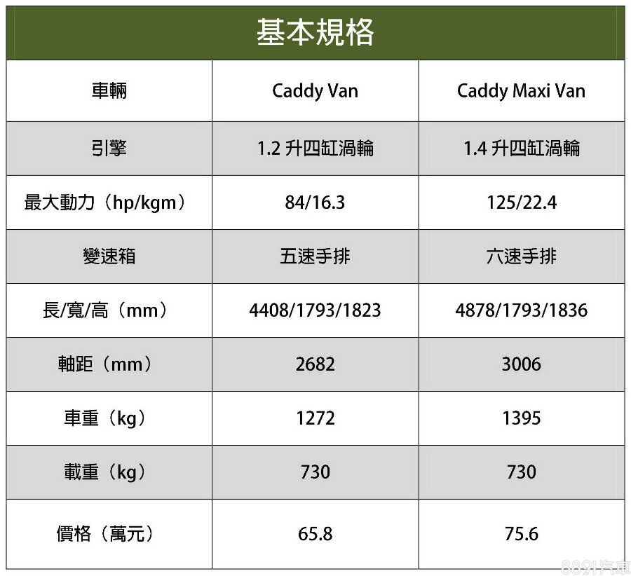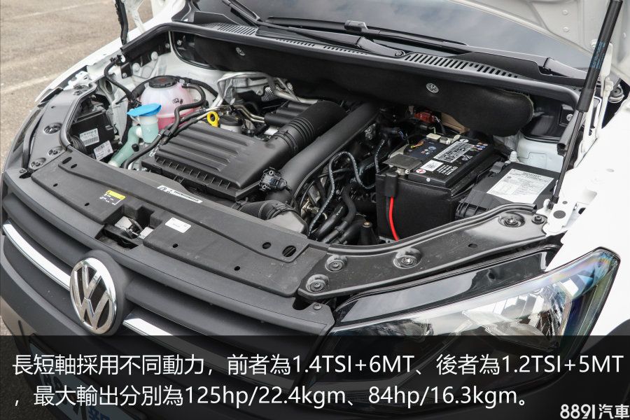 兩車在基本規格上,除了軸距、車長、車重不同之外,長軸因應車重增加,引擎也由1.2TSI升級為1.4TSI,變速箱亦同部由5MT變為6MT;至於貨車較關鍵的載重部分,不因尺碼改變有所不同!