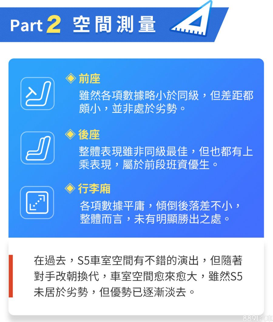 在前座空間上,S5沒有任何一項數據領先,但仔細對比各項數據,S5只有車室高度明顯居於劣勢,其他各項倒是沒有太大差距,整體來說,表現還不至於太差!