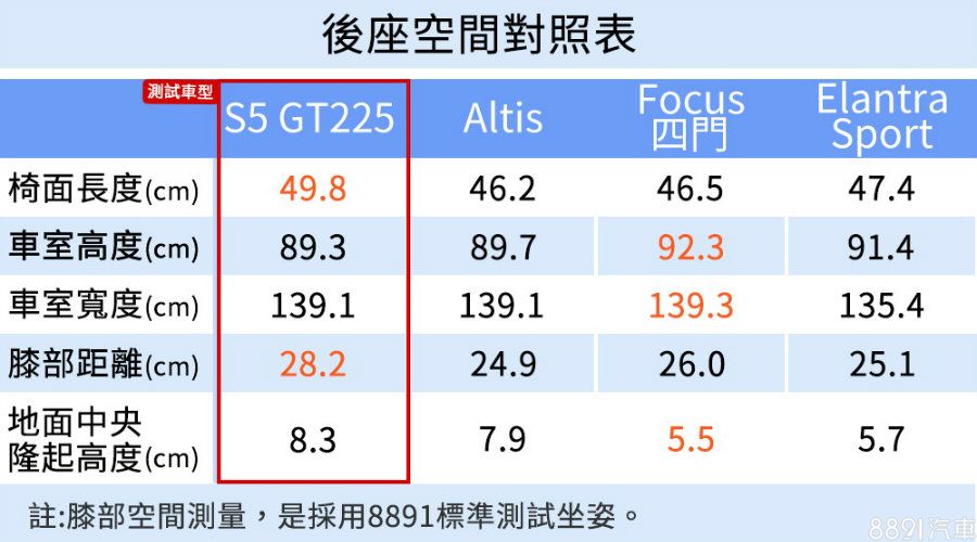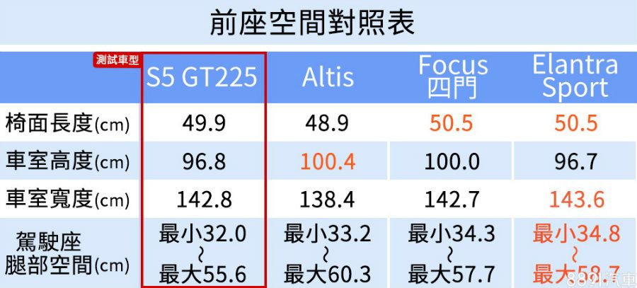 後座空間部分,我們同樣列出Altis、Focus四門與Elantra數據,S5膝部空間最大,同時椅面長度也最長,寬度與最佳的Focus四門差異細微,因此整體來說,S5後座空間面對另外三位對手,表現算是出色。