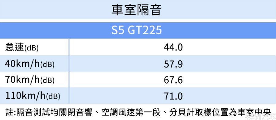 S5 GT225隔音表現不算理想,防火牆隔絕引擎運轉聲的能力有限,怠速狀態下,仍可聽到明顯引擎運轉聲,而隨著車速提高,隨之而來的是明顯的輪胎滾動噪音,由於配胎普利司通T001已屬於較偏向舒適設定,滾動噪音必然低於性能胎款,但S5 GT225車內仍清晰可聞,顯然是底盤隔音工程有提升空間。