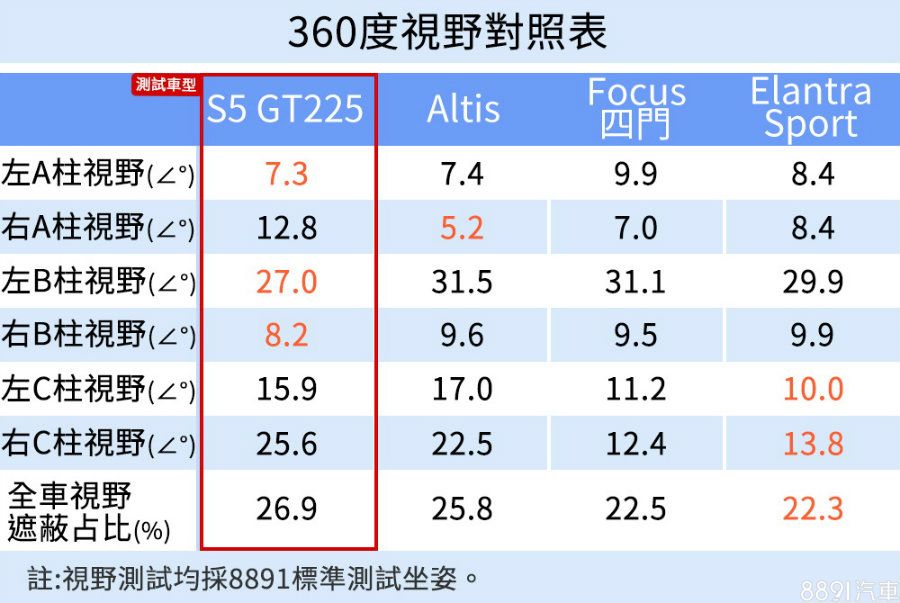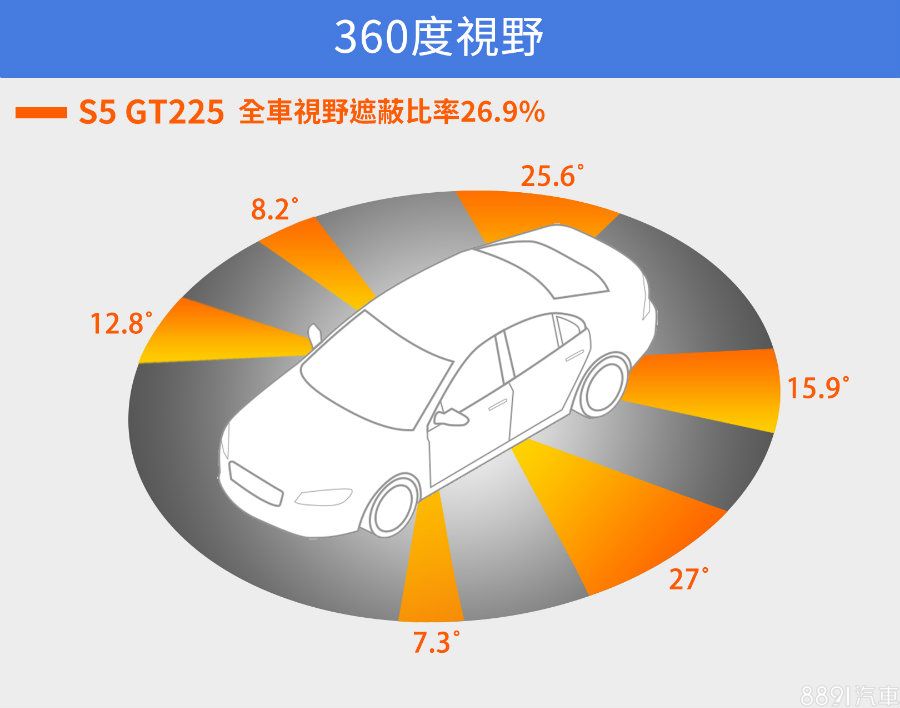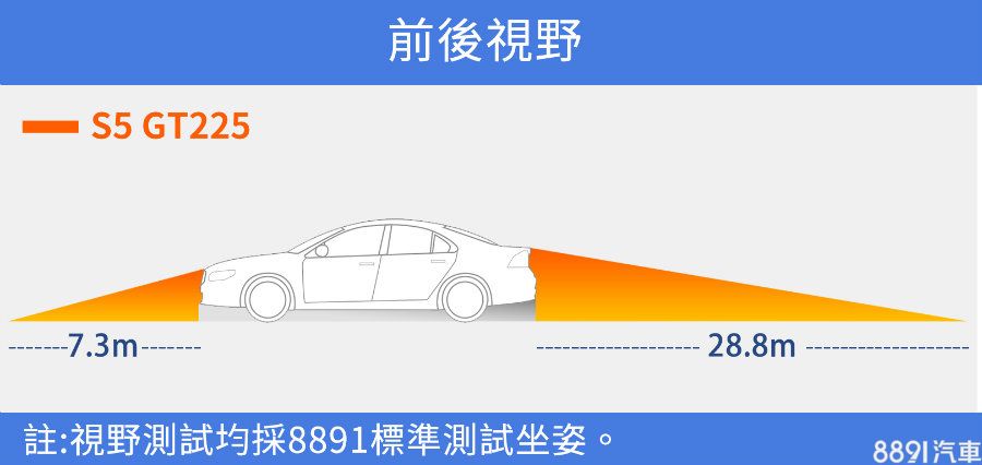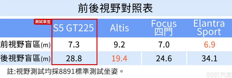 實際測量前後視野盲區,在同樣測試條件下,S5 GT225表現比起另外三車對手,都沒有取得優勢,但倒也非最差,表現平庸中等。