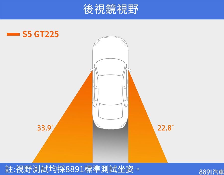 在車外後視鏡視野部分,S5 GT225左右各為33.9度、22.8度,與另外三車對比,兩側數據都屬中等,沒有特別好壞。