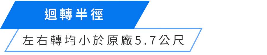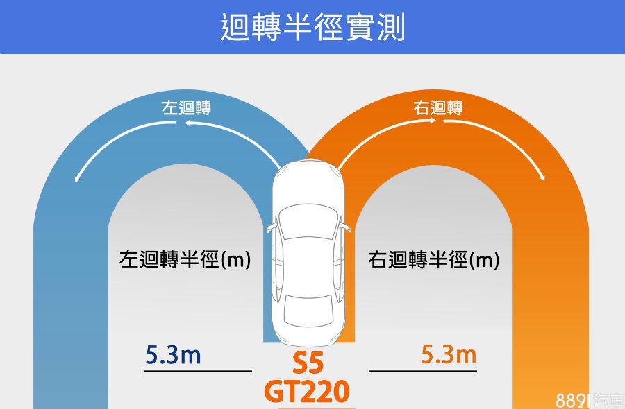 S5 GT225原廠迴轉半徑為5.7公尺,而我們實測數據,左右轉均為5.3公尺,明顯小於原廠值。