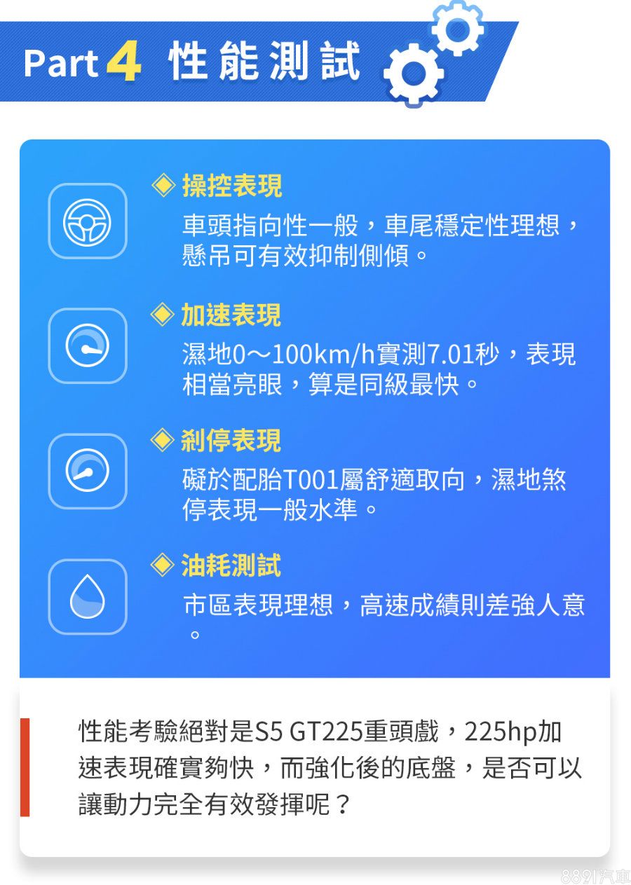 在試車之前,對S5 GT225有很深的期待,因為U6 GT220確實調教的頗為成熟,是一輛動態均衡的運動化SUV,同樣的升級手法換到重心較低的S5,理論上應該會更厲害,但S5 GT225底盤的貼地性不如預期,這在震動測試可說是一目瞭然,而換到賽道上,轉向不夠乾脆俐落、輪胎性能不佳,影響了整體速度,縱使動力充沛,但就是不容易轉化為實際速度,距離國產最速寶座就差那麼一點!