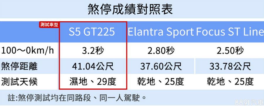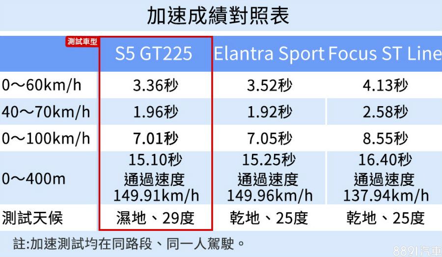 同樣把Elantra Sport、Focus ST Line實測成績紀錄列出對比,在濕地狀況下,S5 GT225實測0~100km/h跑出7.01秒的佳績,成為國產加速王!