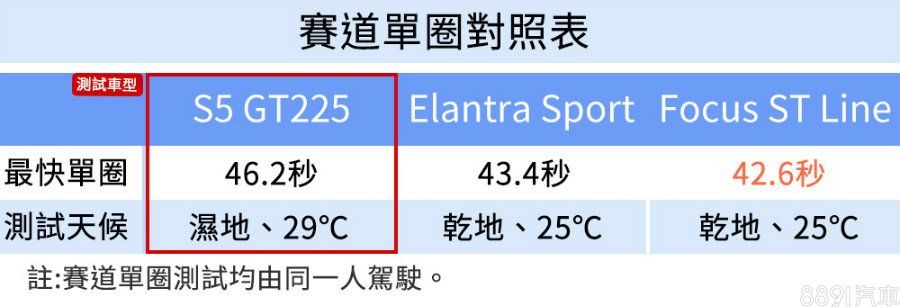 賽道計時當天氣候不穩定,不時飄著細雨,路面微濕,最後S5 GT225最快單圈只跑出46.2秒,同級對手Elantra Sport與Focus ST Line在乾地分別跑出43.2、42.6秒,雖然路面狀況不同,但若S5 GT225挑戰乾地單圈,我們不認為可以削減3秒差距。