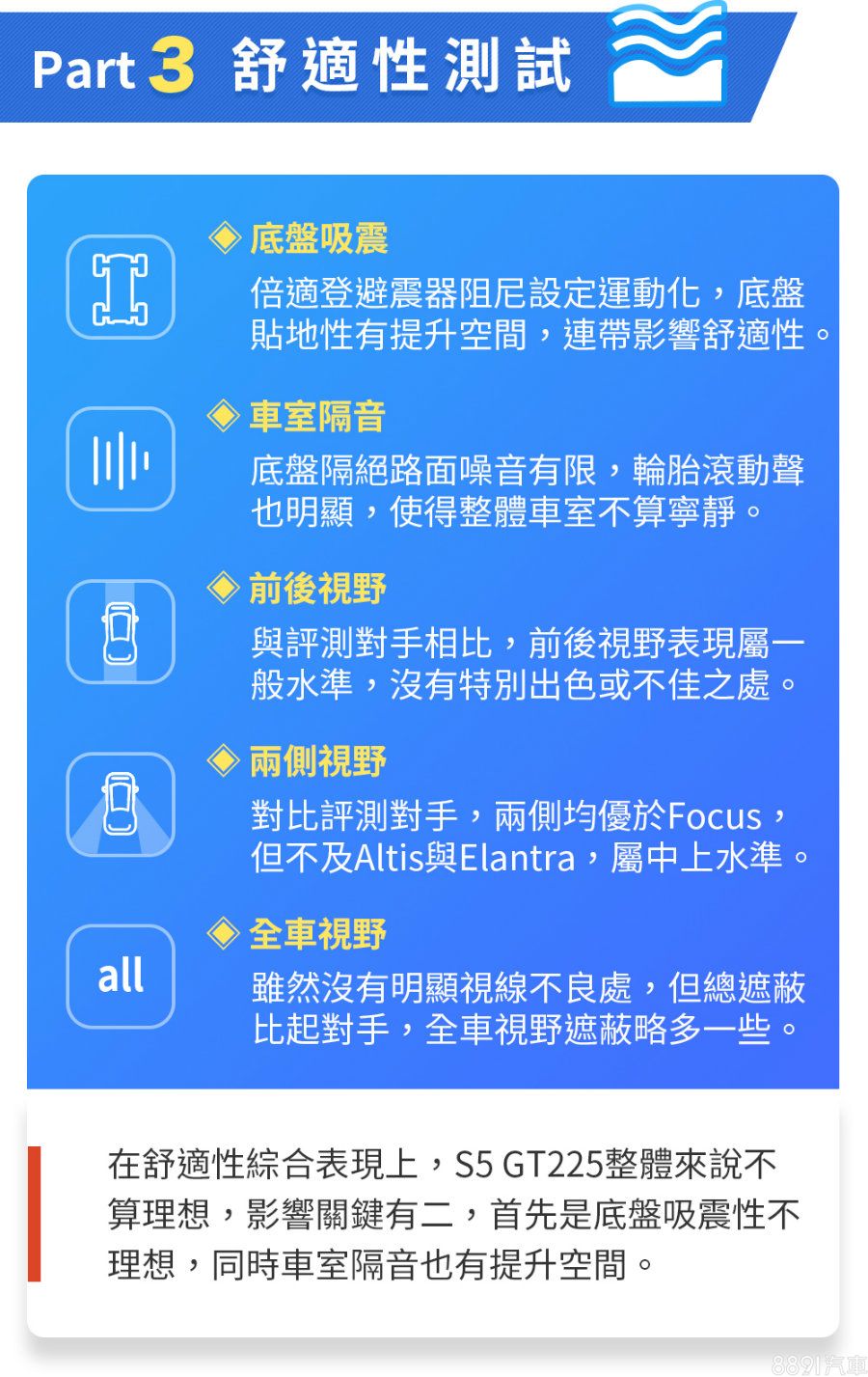 雖然S5座椅造型維持以往,但原廠強調內部泡棉重新設計,用以強化乘坐舒適感,實際上,可以清楚感受到座椅泡棉的優化,乘坐感確實舒服,至於兩側包覆性也有不差的表現,S5 GT225前座乘坐性讓人滿意!