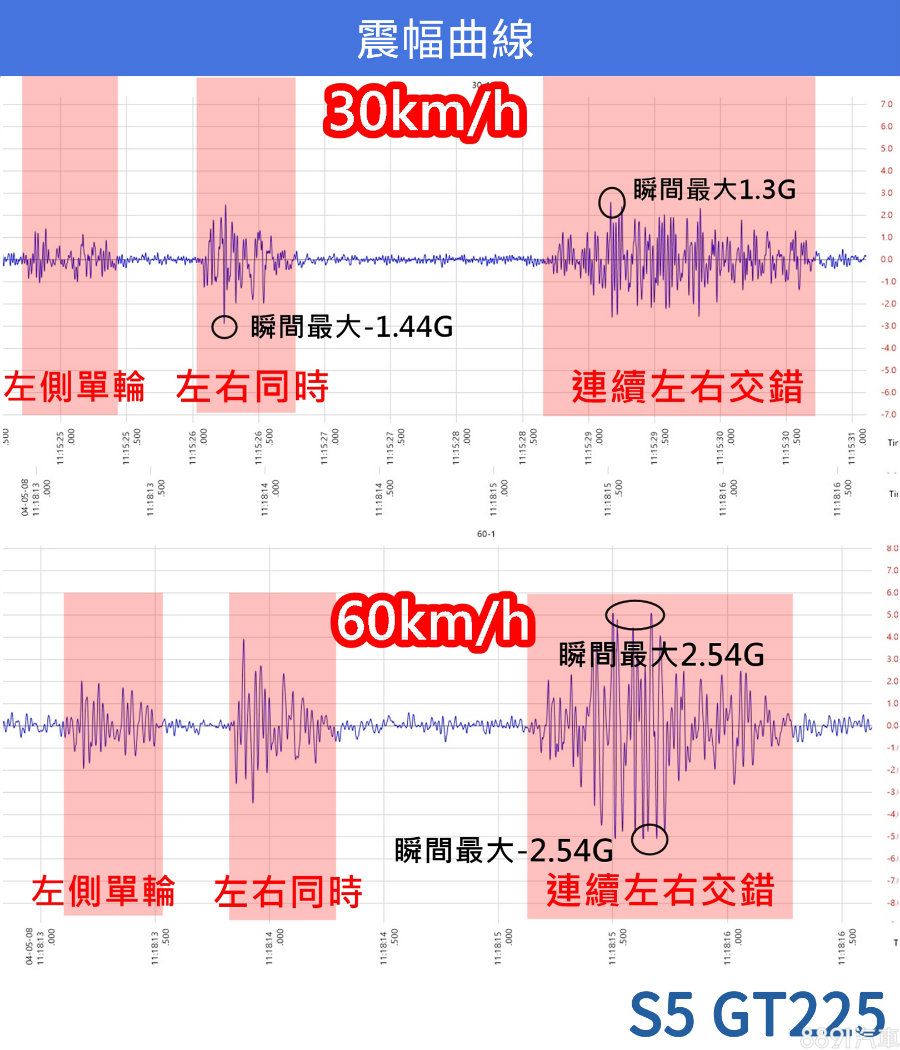 再將30km/h與60km/h的震動數據進行對比,在瞬間最大G值的部分,60km/h無論正負G力都達到儀器感應的上限值,這是連性能鋼砲Golf GTI測試都未出現的情形,但請注意!這不是S5 GT225懸吊比Golf GTI硬,而是衝擊感明顯、吸收力不甚理想!也因為60km/h需承受很大的G值,因此縱使震動時長變短,但震動力總和卻明顯高於30km/h狀態。
