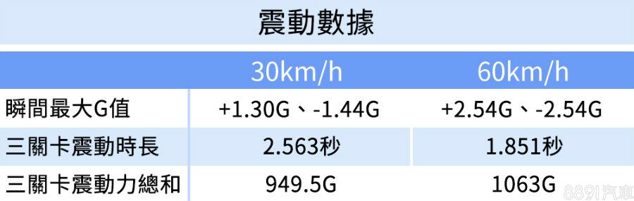 2.震動計算起點統一:起始點為前輪壓到第一根減速條,震動儀產生G值開始計算。後輪壓到最後一根減震條、震動回復近於0時為計算終了。在車速一致、計算起終點都相同之下,所測得的震動數據即可橫向對比。