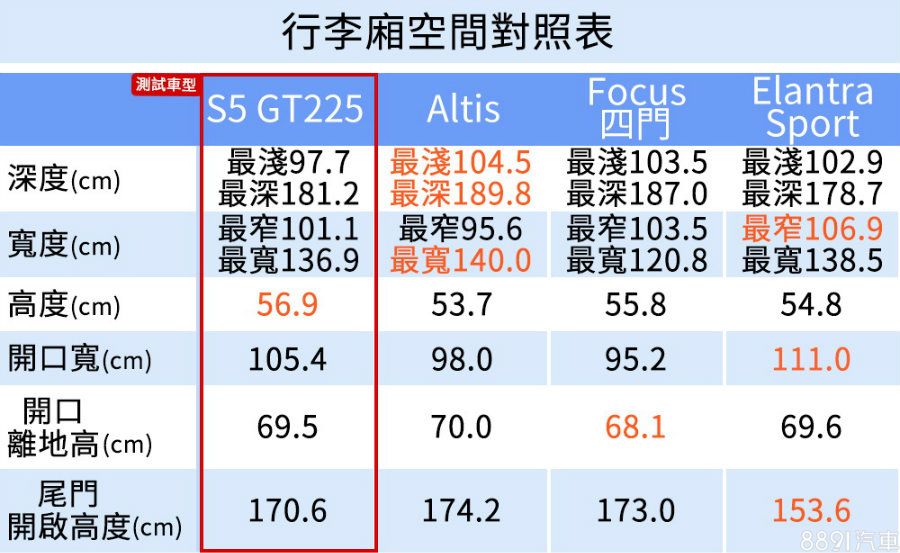 先前超級測試陸續測過Altis、Focus四門與Elantra,都是S5同級距對手,因此在空間測量上,我們把數據整理出來進行對比,讓大家可以清楚知道這四部車的空間優劣。