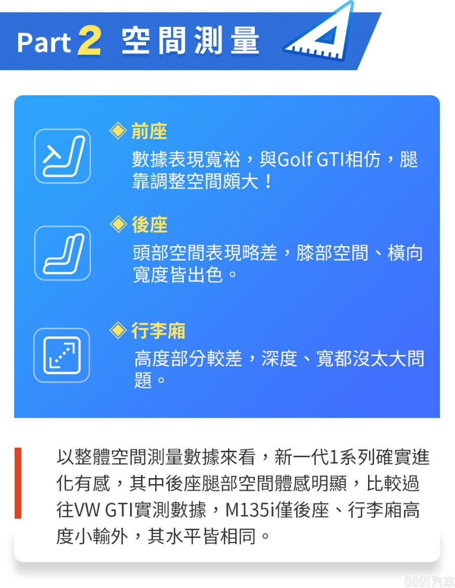 如果對照過往超級測試的中型掀背量測數據,後座主要是寬度表現不夠好,膝部距離一般,另外還有明顯的地板隆起幅度,只能說1系列本來就不是太注重後座需求的車。