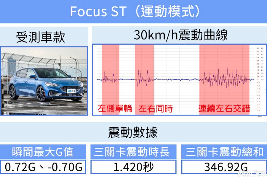 Focus ST是標準的性能鋼砲,但在電子懸吊的幫助下,各模式底盤回饋可有鮮明差異。以標準模式通過30km/h,無論是同時還是連續左右連續陣型,都能展現出不錯的吸震性,車內也無明顯衝擊感,端看震動時長與震動總和兩個數據,也都是標準模式最優。