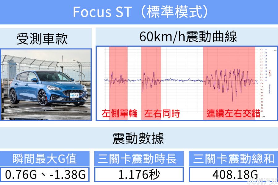 原以為運動模式會較標準更硬,但Focus ST高速阻尼調校優異,相較30km/h震動總和沒大幅增長,體感則是與標準模式差不多,連續左右關卡震幅甚至出現越往深處走、震動越平緩的走向。
