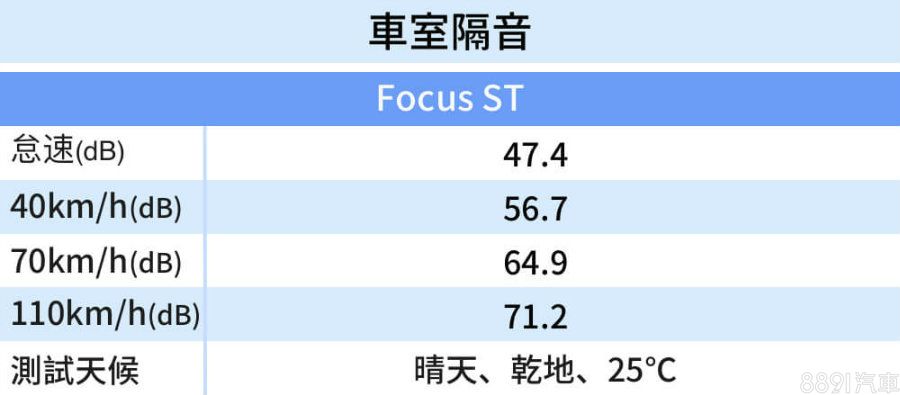 性能車型「聲浪」固然重要,ST配備聲浪模擬系統,且轉速一拉高就頗大聲,美中不足處就是在任何模式下都會開啟,無法手動關閉,此點為影響車室寧靜度的主因,高速實測71.2dB表現一般,除此之外,風切聲、底盤都算寧靜。