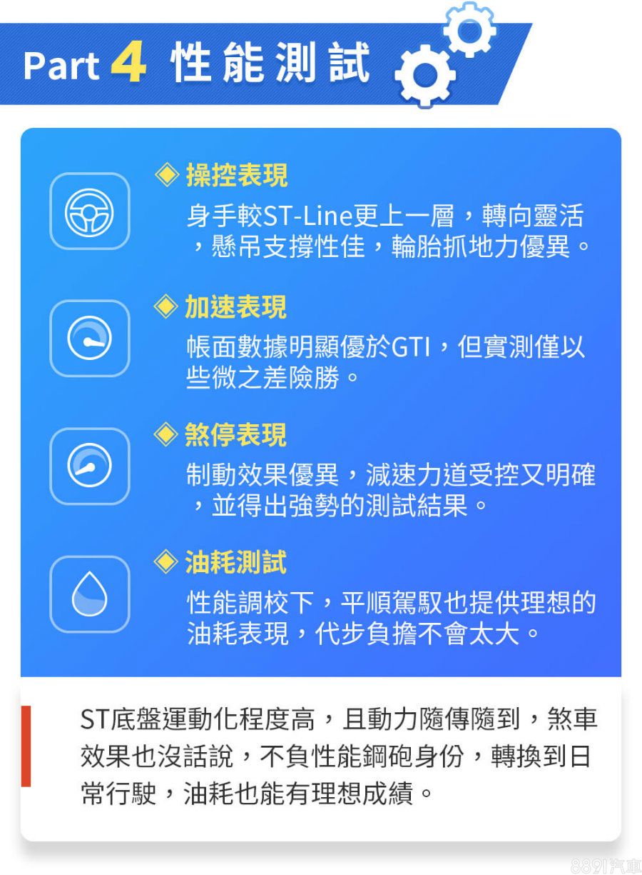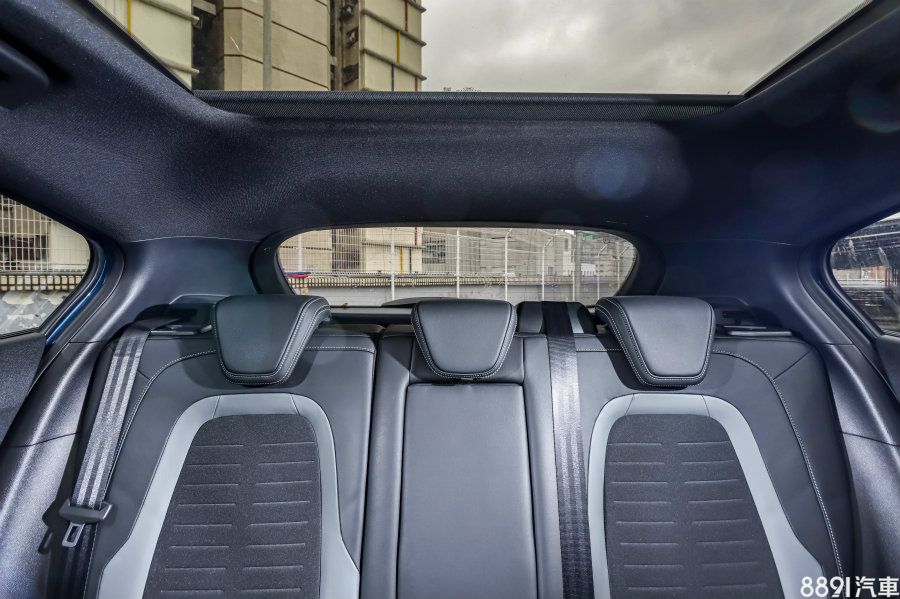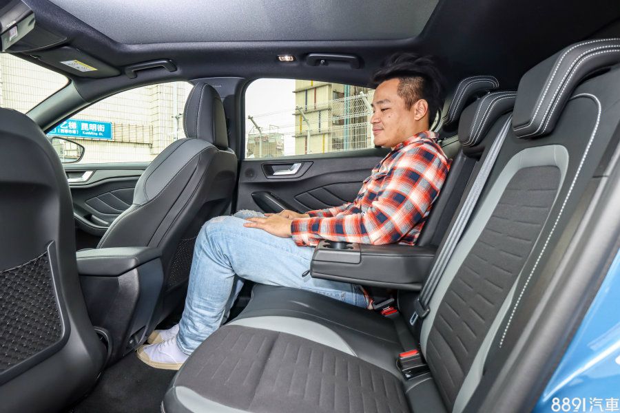 ST後座剪裁與材質應用呼應前面兩張賽車椅,看來帶有性能氣息,實際上泡棉造型卻是與國產ST-Line相同,實測發現膝部空間表現相仿,並不因前座不同而有影響;頭部空間則因為導入全景天窗而稍稍矮了一些,但是全景天窗面積夠大、敞開時所帶來的空間感遠勝過國產ST-Line。