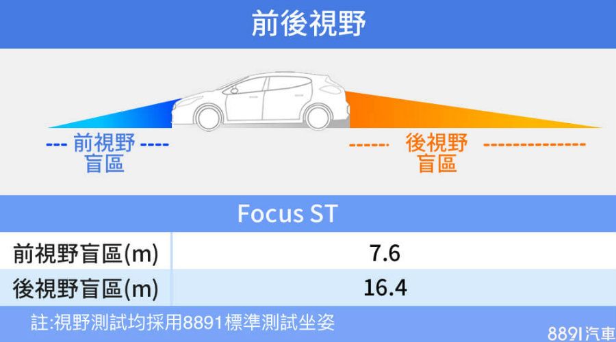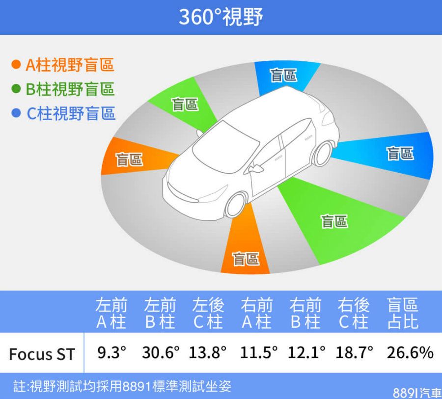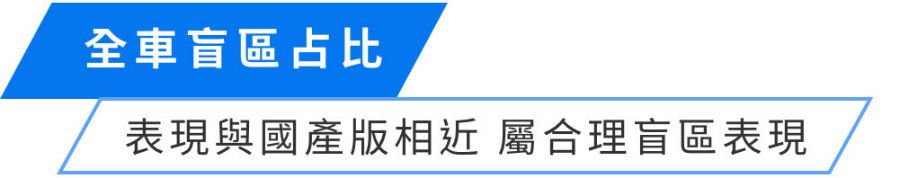 ST與國產版既然車體設計完全相同,360度視野也就沒有太顯著的差異,同樣是各項數據都在合理範圍,A、B、C柱並不會顯著遮擋視野,盲區占比約26.6%,與國產版26.2%差異微乎其微。