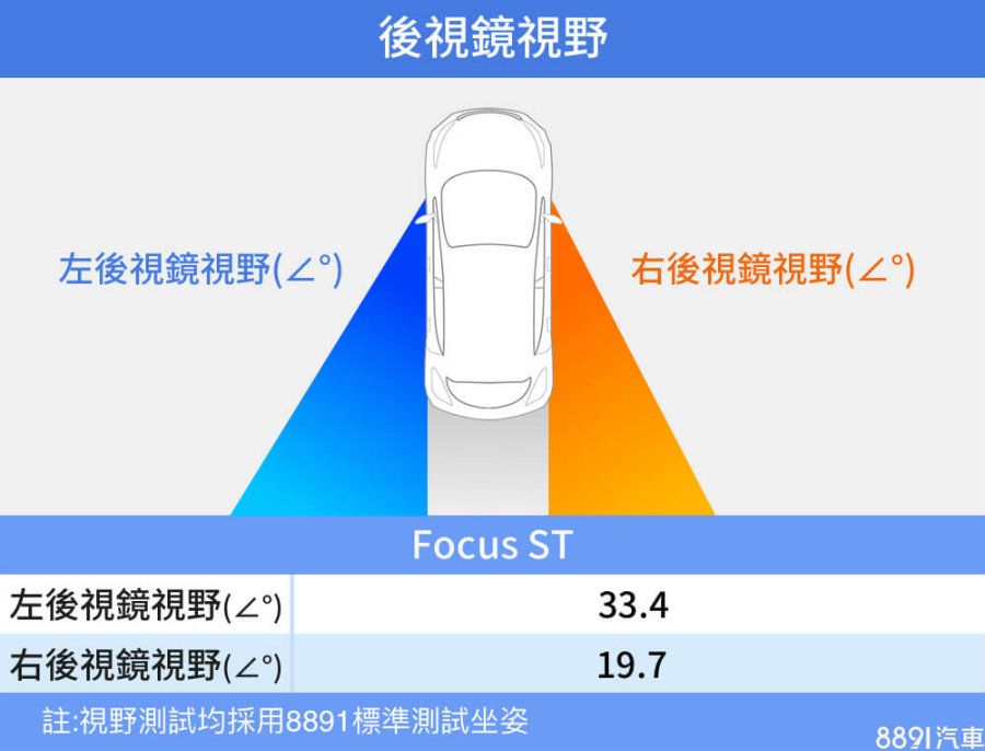 ST後視鏡遍野與國產版本相同,兩側同樣沒有廣角設計,但鏡片反射角度並沒有顯著不同,仍屬合理範圍。另外ST也標配盲點偵測系統,能有效彌補傳統後視鏡的不足之處。
