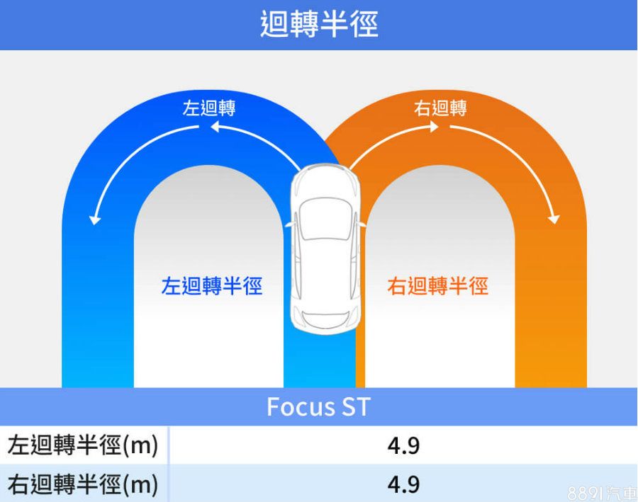 ST強調方向機轉向尺比減少,但最大轉向角度並無改變,實測迴轉半徑數值也和ST-Line相似,左右都是4.9m,表現符合中型車水平。