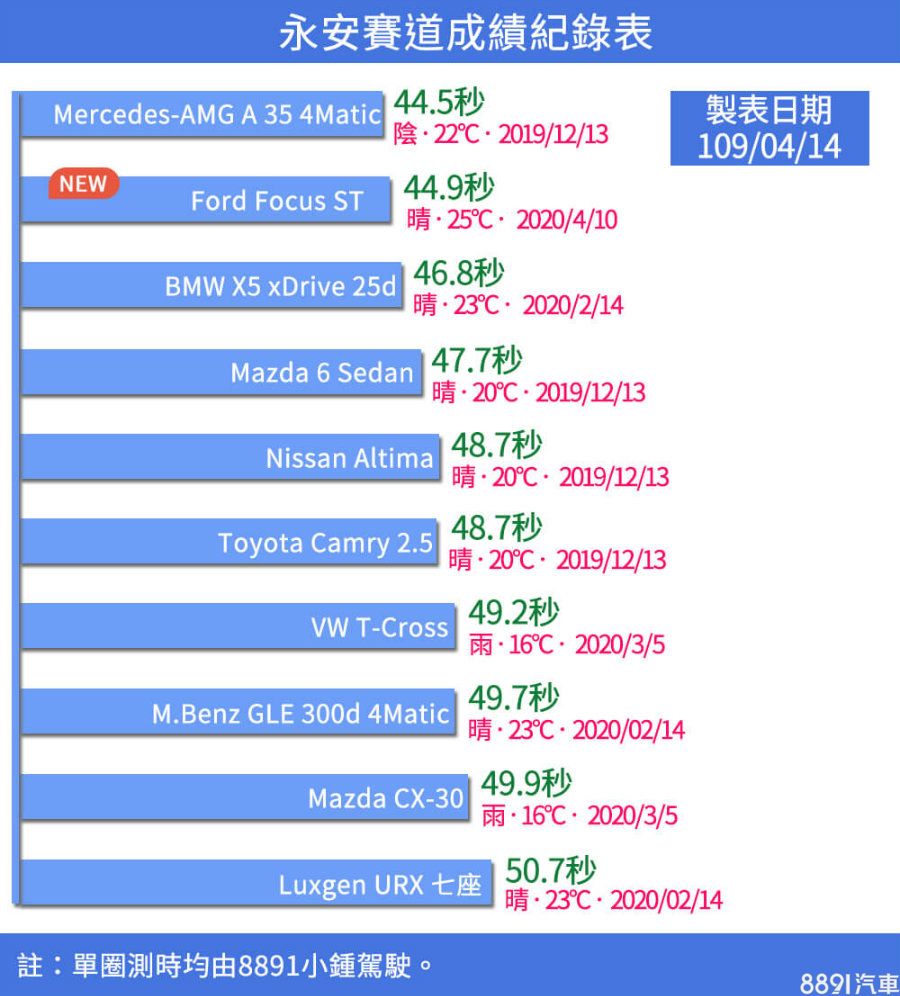Focus ST在賽道上的制動效果穩定又犀利,腳感也容易熟悉,不論是直線底重煞入彎還是進行重心控制都得心應手,配合高等級的性能胎,應付280hp動力很夠用,直到第五圈之後才開始出現過熱衰退的現象,整體而言,底盤和動力的搭配性成熟,動態安定又犀利,對比動力更大+四驅系統的A 35 4Matic,Focus ST能以些微秒差奪下亞軍,實為強悍!