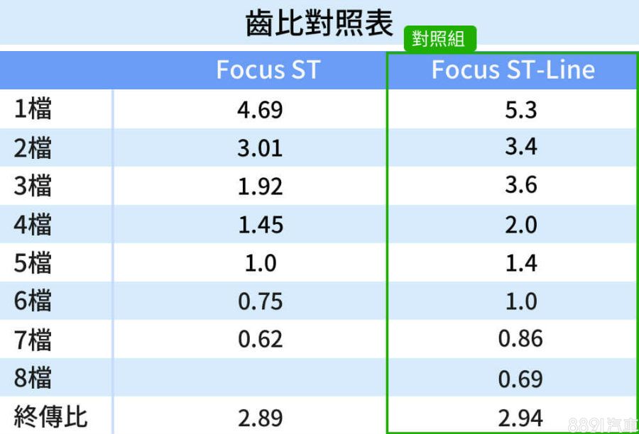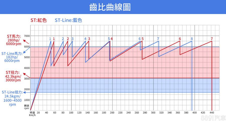 ST的7速變速箱是由ST-Line的8速手自排修改而來,各檔的齒比也經過變化,可看出因ST的動力更大,使用較疏的齒比設定,可看出3檔與4檔的齒比相當接近,可減少再加速的轉速落差,而ST-Line則是2檔與3檔使用較接近的齒比,讓低速換檔有更好的動力反應,至於省油用途的高速巡航檔,ST為6、7檔,ST-Line則是7、8檔,整體造成的速域差別,下圖有更詳細的說明。