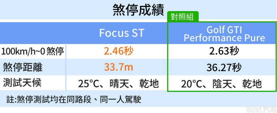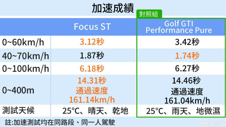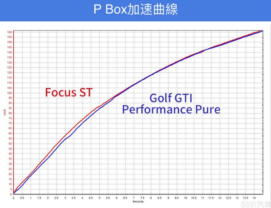 對照過往測試Golf GTI Performance Pure的P Box曲線,Focus ST在100km/h前取得領先,後半段才遭到急起直追,考量到非同時與天候差異的變因,還有Golf GTI Performance Pure當下的測試時,原廠將前輪換成等級較低的配胎,Golf GTI的表現仍有兩把刷子!