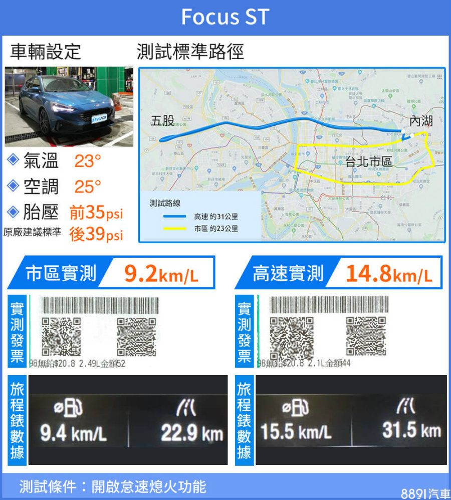 測試當天的路況順暢,Focus ST得出的實測數據並不耗油,怠速熄火功能在市區部分有直接幫助,每個紅燈都能發揮作用,綠燈出發之前都能維持引擎熄火的狀態,且啟動瞬間的震動也小,最後得出9.2km/L的理想數據,而高速的14.8km/L不算特別厲害,但以一輛性能鋼砲而言,動力、輪胎都非節能設定,每天通勤代步應該也不構成太大負擔。