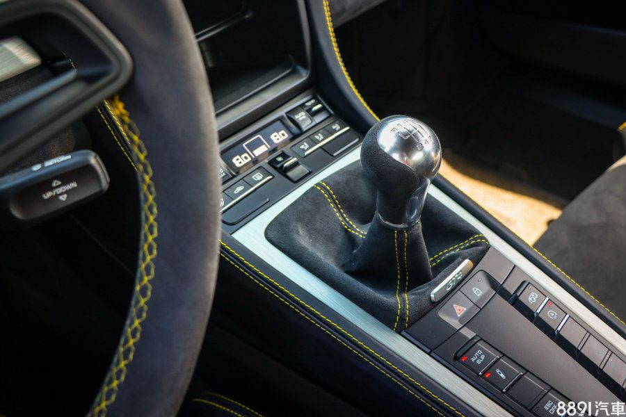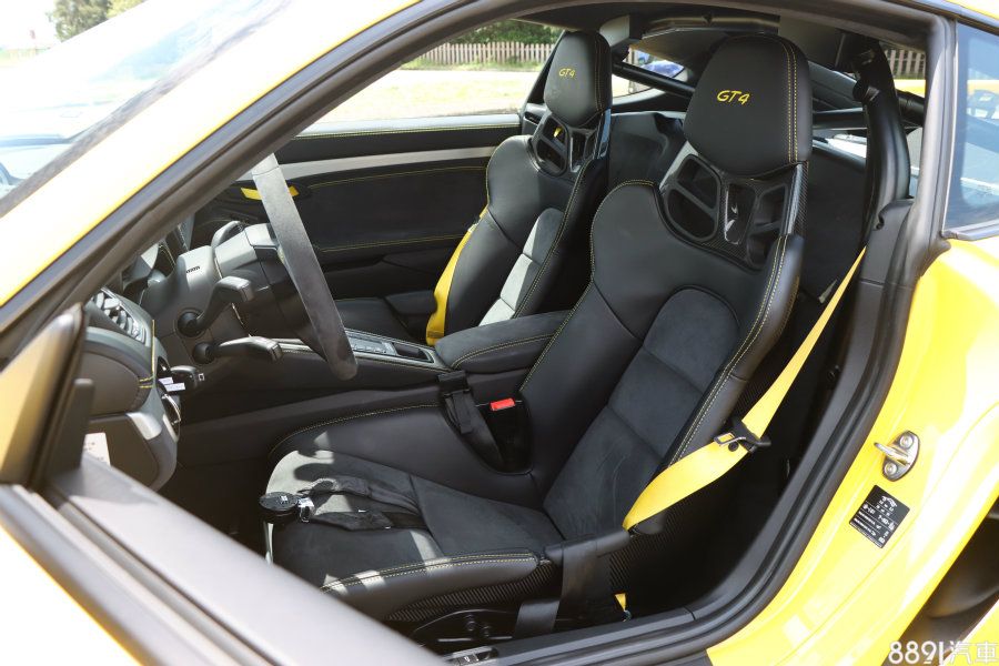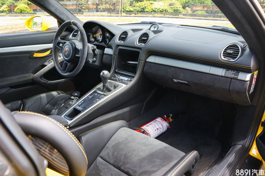 這輛718 Cayman GT4內裝有不少選配,首先是黑色真皮/麂皮搭配黃色對比色縫線(11.18萬),中控台上方有了真皮包覆後,質感增進不少,而對比色縫線也讓視覺多了一點變化。這輛車最特殊的選配應該是「刪除音響通訊系統」,但取消可不會減價,完全就是硬派、真男人的行為,取消之後,沒音樂可聽事小,但倒車雷達車距感應也一併取消,沒有倒車雷達,停車時,完全考驗駕駛人對車輛的空間感,是一種另類的硬派!