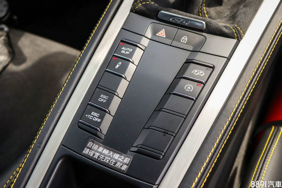 GT4有一個Auto Blip自動補油功能,這在愈來愈多高性能手排車都可以看到,退檔時電腦會自動補油避免頓挫,激烈操駕時也無須執行跟趾動作,降低了一些手排車技術門檻,而經過長時間試車,無論任何檔位、車速、檔位,Auto Blip補油都相當的精準到位。再往下,有ESC Off、ESC+TC Off循跡系統按鍵,也就是關閉第一段和全關的差異,這按鍵規劃和991 GT3相同。