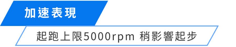 加速測試進行彈射起步時發現,引擎轉速只能拉至5000rpm,295mm的Pilot Sport Cup2稍為打滑後就緊抓住地面,因此在0.8秒時出現明顯頓挫,速度小有停頓、G值明顯下滑,若起跑轉速可以更高,讓起跑動作一氣呵成,相信能跑出更好的成績。經過多趟測試,0~100km/h實測最佳紀錄為4.92秒,通過四百公尺為12.9秒、182.1km/h。