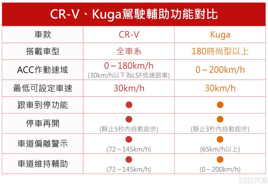 兩車ACC皆為全速域,也都支援跟車到停及停車再開,其中CR-V於靜止5秒內都可自動起步跟上前車,較Kuga的3秒寬裕;不過車道偏離警示及維持輔助則都是Kuga的作動時速較為全面。