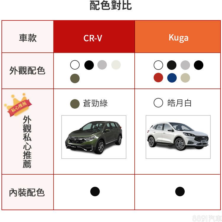 Kuga可選車色較多樣化,除基本的黑、白、灰及銀之外還有數種亮色系可選擇,私心推薦白色是因為既可呈現與車身防刮塑料的對比,又比較不容易看膩。CR-V則只有「蒼勁綠」較為特別,不會太過高調,又帶有質感,成為私心推薦車色。