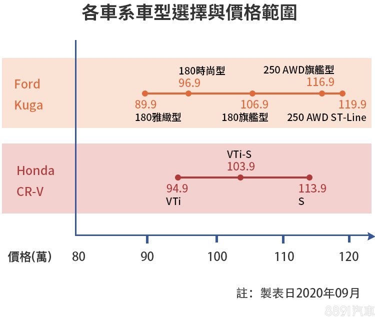 大改款Kuga帶來雙動力、5車型編成,並將受訂生產的入門等級雅緻型售價壓至90萬元以內,拉低入手門檻;中階主力車型定價與CR-V相去不遠,佔車系內銷售大宗。高階的250雙車型則是目前此級距中少有的大馬力四驅SUV,主攻追求性能C/P值的買家。