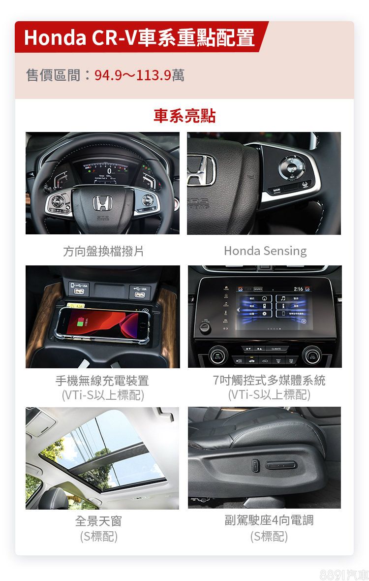 CR-V很懂此級距買家重視安全、空間及C/P值,因此全車系都將Honda Sensing駕駛輔助系統列為標配,入門VTi車型即享有Keyless、Auto Hold、倒車顯影及後座出風口等舒適便利機能,除了缺少觸控多媒體系統及恆溫空調之外,已算是齊全;高階車型則有電動尾門、手機無線充電裝置、全景天窗及雙前座電動調整等配備加持,較小改款前更加豐富。此外,稱霸同級休旅的寬敞空間也是CR-V車系的最大賣點。