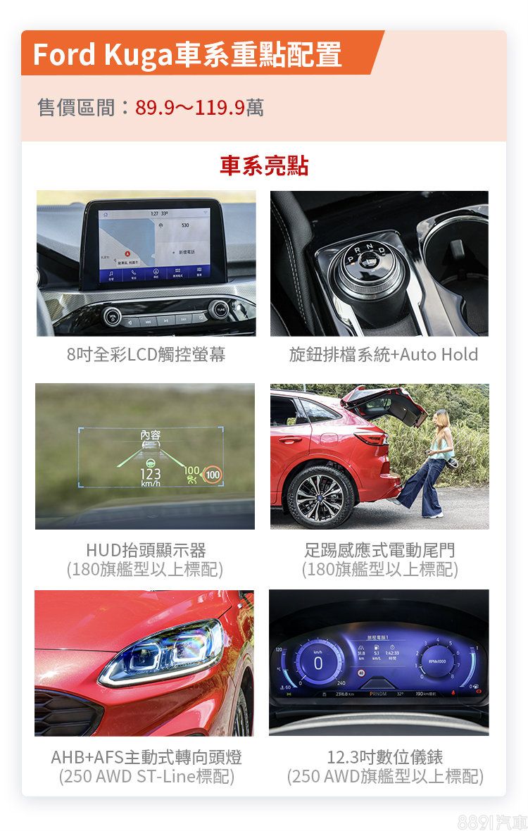 撇除受訂生產、配備精簡的180雅緻型,Kuga自96.9萬元的180時尚型就將Co-Pilot360駕駛輔助系統、Keyless、8吋觸控螢幕、雙區恆溫空調、後座出風口及倒車顯影等納入標配,而不到110萬元的180旗艦型更搭載感應式電動尾門、全景天窗、6.5吋儀錶資訊幕、SYNC3系統、抬頭顯示器、B&O環繞音響及真皮座椅等,配備堆疊不手軟,拿出滿滿誠意;唯獨只有乘坐空間表現在級距中不甚突出。