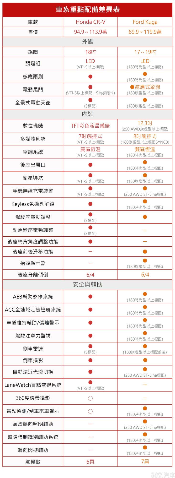 就價格及配備差異來看,Kuga各車型的標配項目都要比價位相近的CR-V車型來得多,C/P值較高。另外,主被動安全配備也是Kuga相對完整,除了基本的AEB、ACC及車道維持輔助之外,還配備盲點偵測、道路標誌識別和緊急轉向閃避輔助等,在CR-V上不是列為選配就是無搭載,僅有無配備360度環景攝影這點較為可惜。