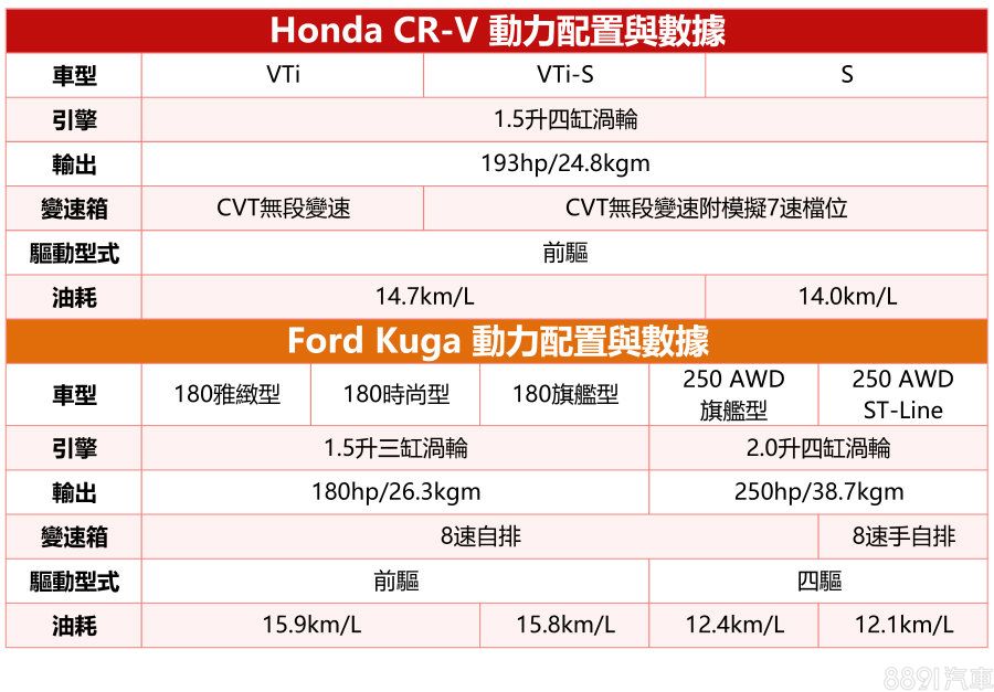 論排氣量相同的CR-V及Kuga 180,前者馬力佔上優勢,後者扭力小幅勝出,帳面數據不相上下,對應平時通勤代步需求皆游刃有餘;能源局公布的平均油耗則以Kuga 180表現較為出色。當然,若真講究性能,那Kuga 250絕對壓倒性獲勝,但相對的,油耗及稅金都得多付出代價。