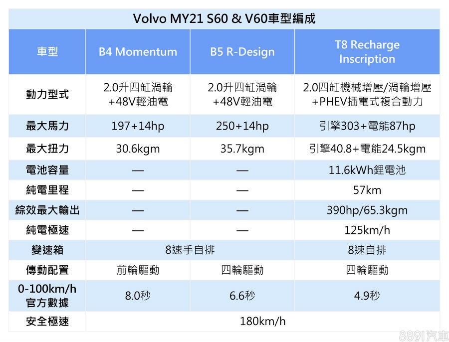 隨著21年式更新,V60/S60將T4、T5加入48V輕油電系統,並改名為B4與B5,而先前作為車系旗艦的T6車型則由更高階的T8版本取代,同樣採PHEV插電式混合動力,不過引擎輸出由253hp提升至303hp,也讓最大綜效輸出增加了50hp來到390hp。
