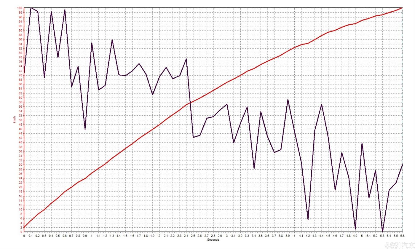 架上P Box實測,0~100km/h加速最快5.58秒完成,相較原廠數據4.9秒的差距還算合理,不過對比先前T6車型參與超級測試的6.33秒實測數據,燃油引擎多了這50hp,在加速表現上確實帶來明顯差異,數據已經是性能車水準。