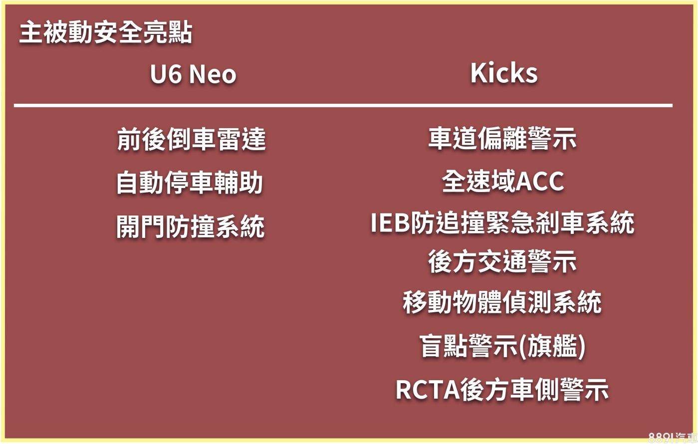Kicks最大價值在於主被動安全豐富,光是多了全速域ACC就很加分,可以大幅降低長途駕駛的疲勞感,另外還有前方主動煞停、RCTA後方警示,安全防護更加全面。U6 Neo雖然少了上述功能,但有自動停車輔助倒是不錯,尤其車格對手大,停車便利是加分項。