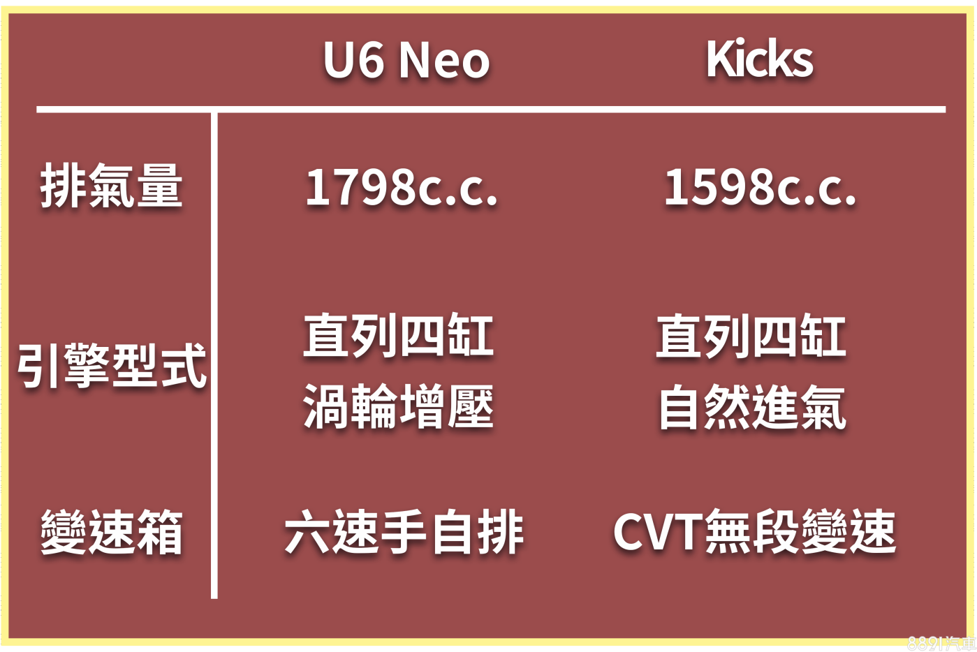 兩者動力架構差異明顯,U6 Neo採用1.8升渦輪增壓設定,搭配上6速手排變速箱,比起同場競品有動力輸出優勢,會更有運動感;Kicks則是同級跨界休旅常見的自然進氣設定,搭配上CVT無段變速箱,車款訴求就是平順好開的都會休旅。