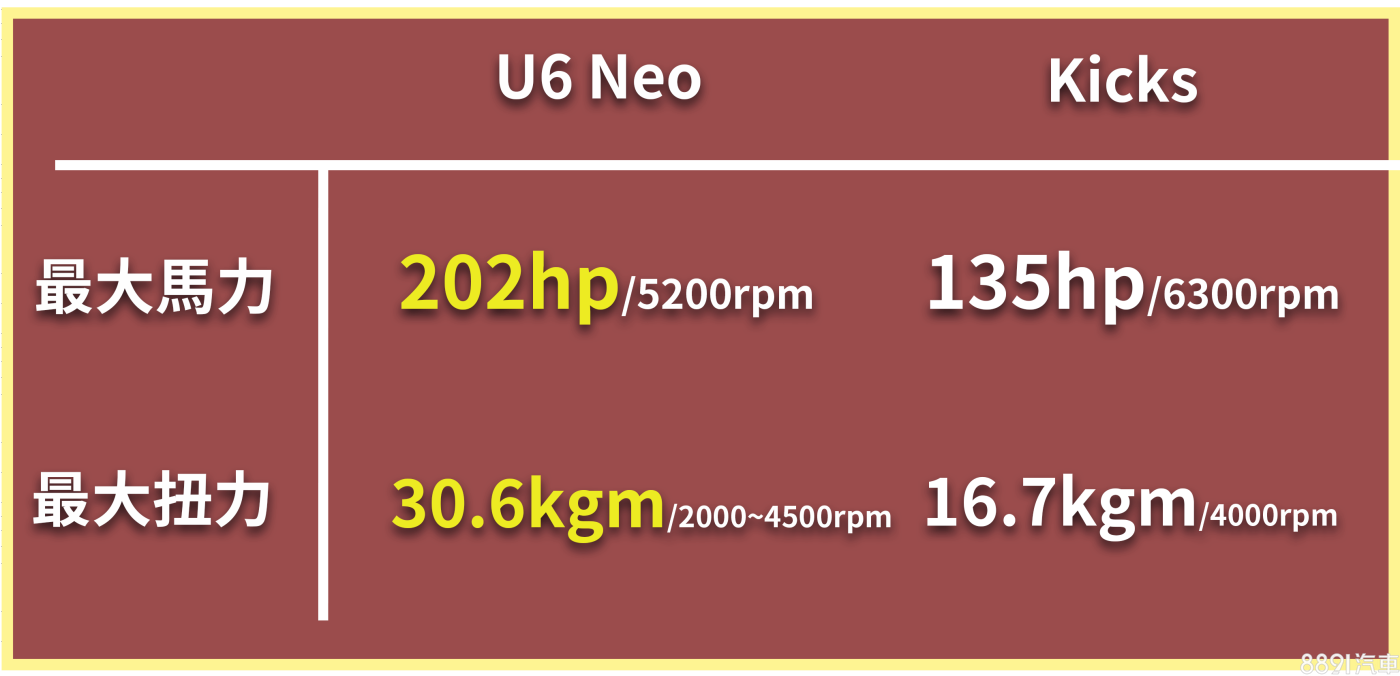 列出兩車動力數據,渦輪動力的U6 Neo在2000~4500rpm可輸出30.6kgm扭力,比起對手的扭力好球帶更提前,在低速時就有飽滿動力,5200rpm則有202hp大馬力,適合追求性能的買家。至於Kicks馬力小了67hp,扭力更是直接腰斬,這動力就是符合代步需求,經濟性為主。