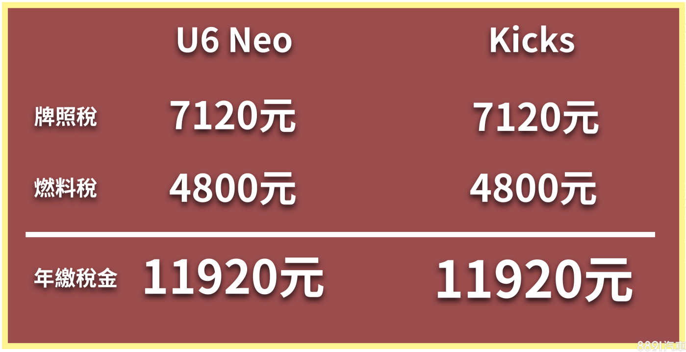 U6 Neo排氣量為1798c.c.,正好壓在1.8升稅金級距內,與排量1.6升的Kicks稅金級距相同,年繳牌照稅+燃料稅共計11920元。