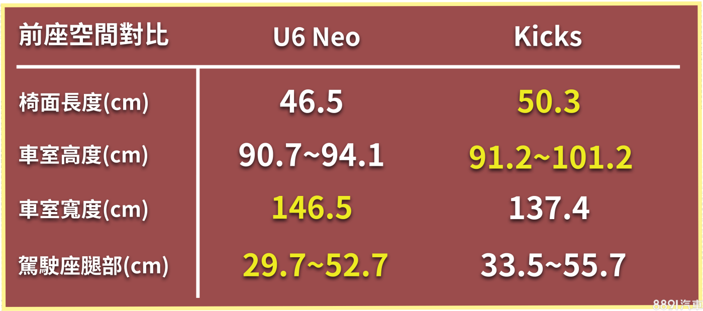 U6 Neo車格比對手大,優勢也體現於車內空間,雖然頭部略矮,但橫向空間開闊有感。Kicks空間明顯較窄,但頭部高度好,可以消弭壓迫感,再來是椅面長度夠,可以獲得更好乘坐人體工學,優化大腿支撐性。