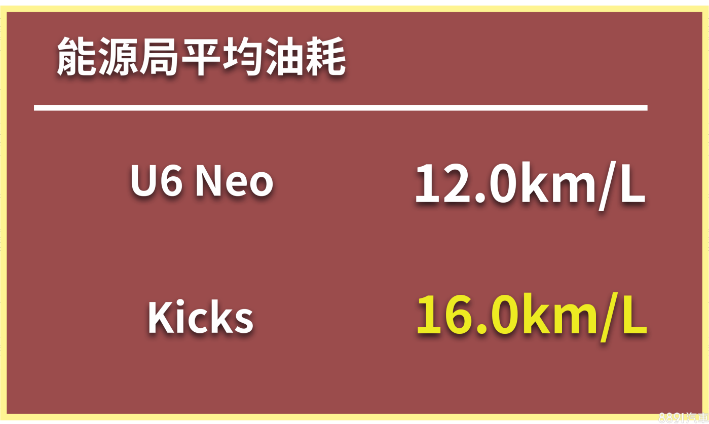 想要壓榨馬力,油耗自然不會理想,U6 Neo能源局平均油耗僅有12.0km/L。如果想省油,買Kicks準沒錯,原廠強調氣缸壁採用鏡面熔射缸孔技術,能降低活塞摩擦阻力,對於油耗、動力都有幫助,能源局平均油耗為16.0km/L。