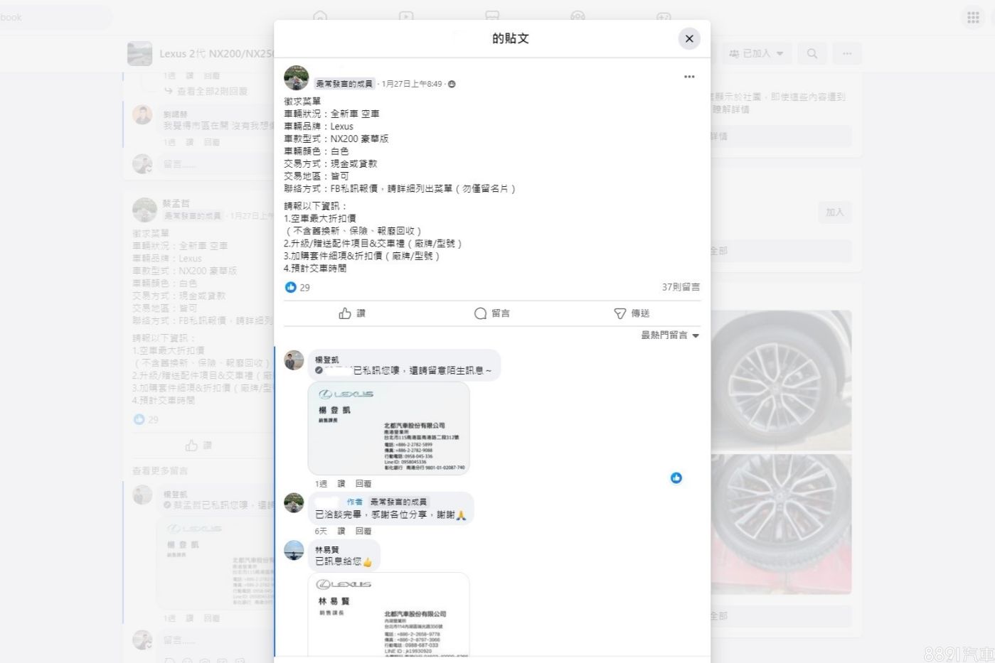 買車詢價除了找汽車業務外,其實問「過來人」更有效率!拜網路發達之賜,現今消費者有多元管道獲得新車資訊,各種新車優惠充斥於各大論壇、社群粉專,經常可以看到有人發問「求菜單」,很快就會有駐版業務接洽或是其他車友分享,基本上售價已屬透明,即便要進一步進行比價,有菜單「白紙黑字」做依據對雙方也比較公平!(圖翻攝自Lexus 2代 NX200/NX250/NX350/NX450 車友俱樂部臉書社團)
