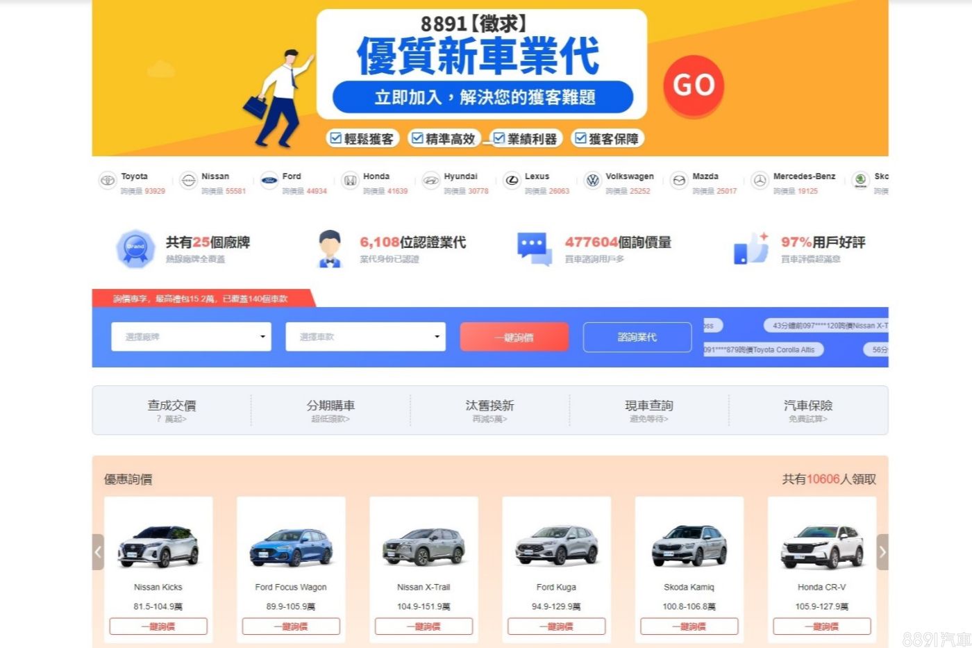 這不是老王賣瓜,是8891不只是全台最大的中古車交易平台,就連新車也有超完整的「一站式」購車服務!消費者除了可以線上賞車,觀看其他人的購車菜單、成交故事之外,最重要是8891持續拓展優質業代服務,目前線上已有超過6千位認證業代、涵蓋25個熱銷廠牌,想買什麼車,只要動動小手點選「一鍵詢價」功能,就會有3名推薦業代主動與你聯繫與報價,若有中意,後續賞車、試駕等需求也能一併安排,把複雜的買車過程簡單化,助你省時、省心、又省錢!