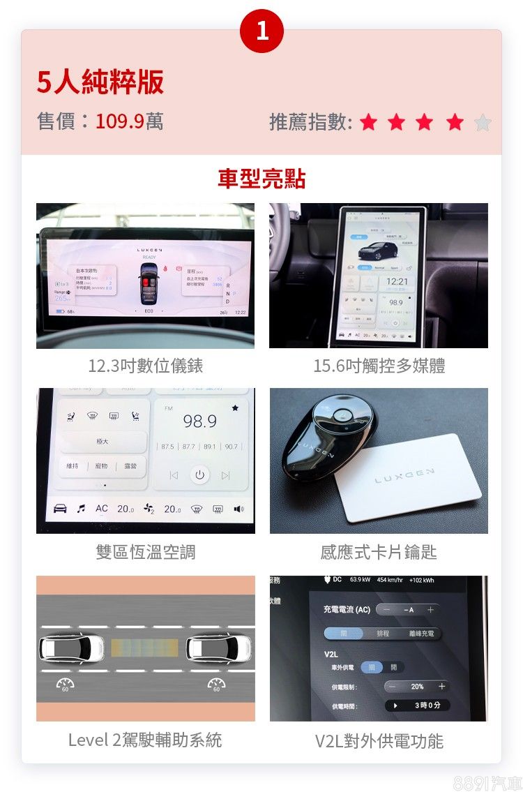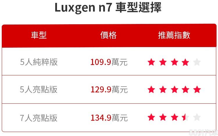 Luxgen n7提供單一單馬達後驅動力、三種等級,除了首批預購的準車主享有入門款99.9萬之優惠,目前開價分別為109.9、129.9與134.9萬元,其實入門款配備就有不錯的底子,但只要多花20萬入主5人亮點版,就能享受更多舒適度與科技感,C/P值拉高不少,因此最推薦給普羅買家,至於7人亮點版雖然只貴了5萬,但畢竟是5+2座中型休旅尺碼,第三排空間本就有限,值不值得升級,端看個人用車需求了!