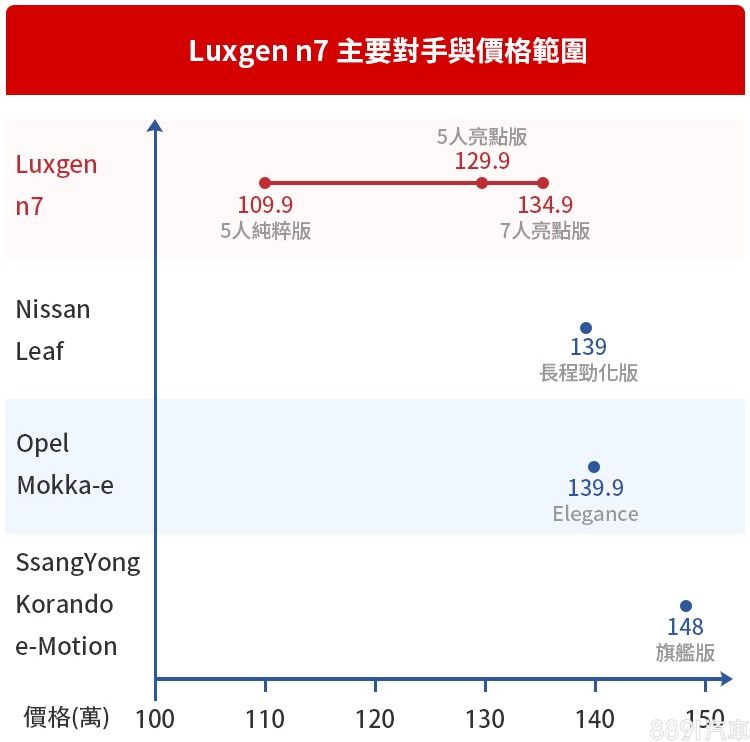 n7國產中型純電休旅的身分、百萬出頭的起始價,在台灣市場並無直接對手,因此我們用價格來看,以目前150萬以下的電動車,就足以堪稱「親民」作為分水嶺,找出3款對手。其中n7是當前最火熱的中型SUV級距,且是四車中唯一有5+2座選項的車款,能觸及的客群最多元,Korando e-Motion尺碼與大家熟悉的Corolla Cross相近,為中小型休旅,Mokka-e是更小一號的都會跨界,Leaf則是中型掀背,顯而易見n7在價位與車身型式方面都取得頗大優勢。