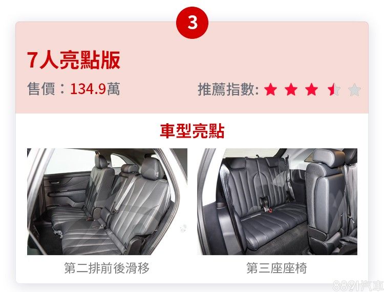 多加五萬升級7人亮點版,獲得第三排座椅,同時第二排也多了前後滑移功能,其餘配備則沒增加,主要是增加載人的機能性,不過通常「5+2座」無需對空間期望太大,實際使用經驗,第三排進出困難,屬於應急或較適合身材瘦小的人員乘坐,個人覺得如有真有多人乘載需求,以這價位來說,MPV可能會是更適合的選擇。